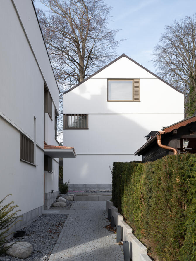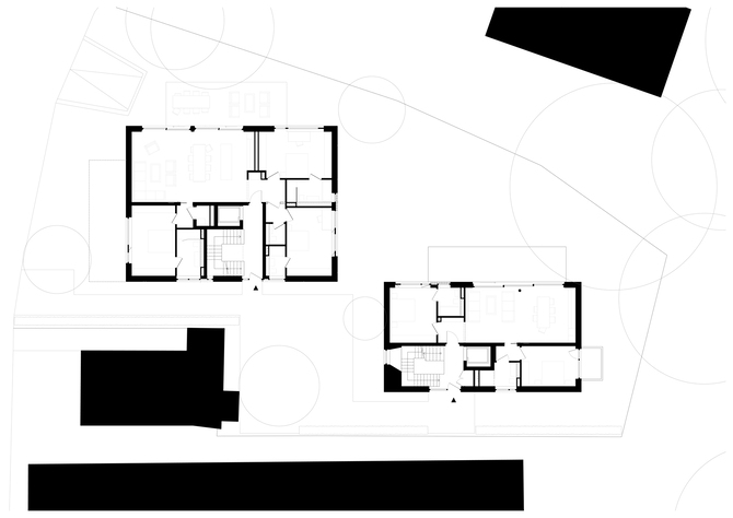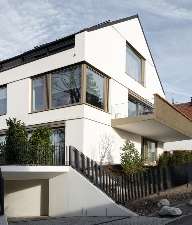 Two small residential buildings with five genereous appartments in the immediate surroundings of the summer palace of the former bavarian king Ludwig II. The buildings are constructed in a mixed structure in whitewashed brick and concrete.