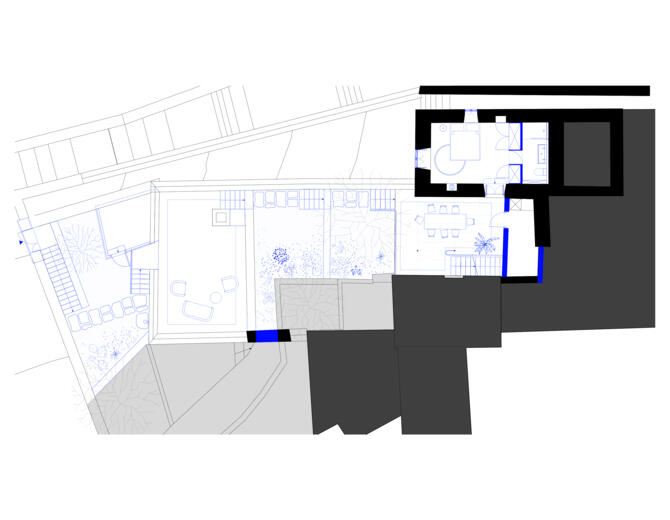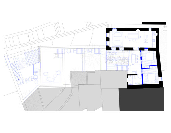 For the remodelling, only sensitive interventions to the façade in the form of a few additional window openings are planned. The roof is to be completely renewed and rebuilt using traditional construction methods. The interior is to be carefully renovated with respect for the original structure of the house. A new access route to the property on the western street leads upwards along the terraced garden and ends in the sheltered inner courtyard area of the L-shaped building.