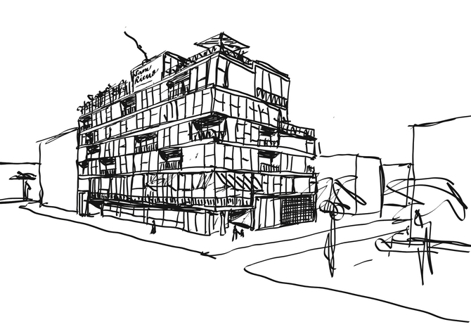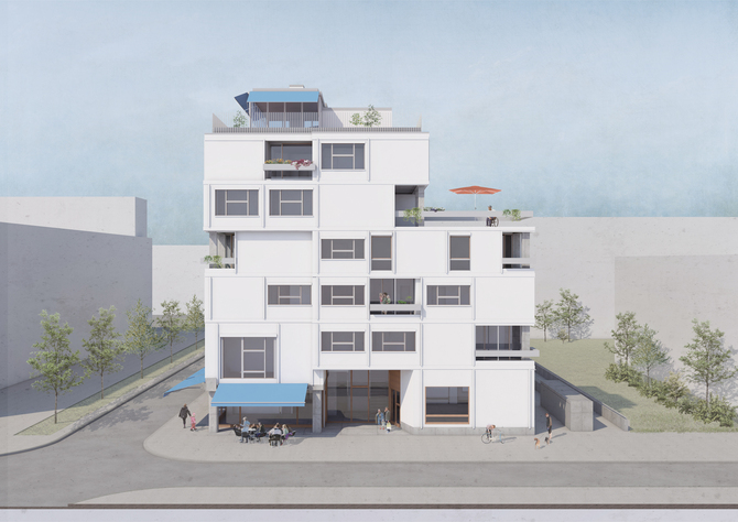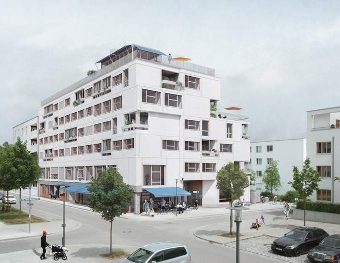 The newly founded housing cooperative "Kooperative Großstadt" wants to implement new forms of urban housing in its first project in Munich Riem: diverse apartment sizes and types, tested typologies as well as completely new concepts of transformable and adaptable forms of co-living shall be accomodated within a building volume predetermined by a masterplan. Our proposal is a first implementation of what we like to call an "inhabitable structure": A generic, flexible and robust load bearing concrete frame, that allows for the (random) accomodation of typologicaly heterogeneous flats, whose partition walls can be adapted or even completely replaced in the long run. The facade is conceived with prefabricated wooden elements that come delivered to the construction site with windows and sun protection integrated and are merely assembled (and later disassembled) on site.