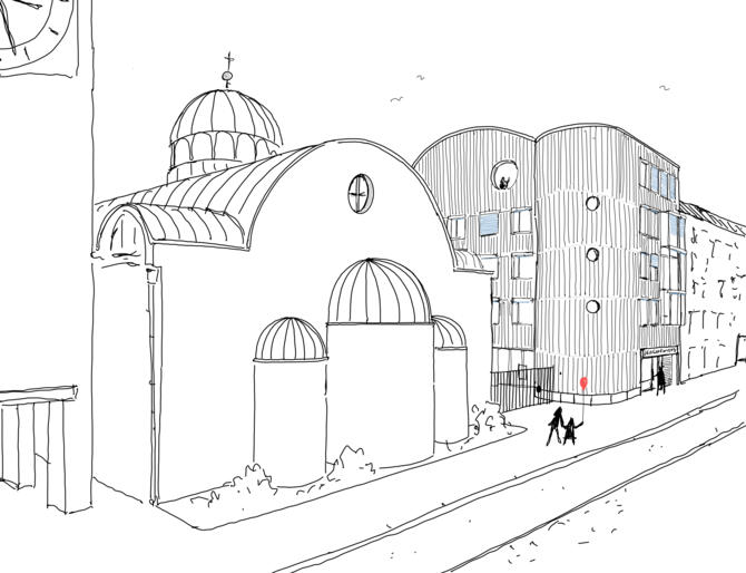 Unmittelbar angrenzend an die Allerheiligenkirche der Griechisch-Orthodoxen Gemeinde im Münchner Stadtteil Schwabing soll ein Generationenhaus errichtet werden. Das Geviert, auf dem das Grundstück liegt, ist gekennzeichnet durch eine sich auflösende Blockrandbebabauung der nördlich gelegenen Baublöcke. Derzeit befindet sich auf dem Grundstück ein eingeschossiger Gewerbebau eines Steinmetzes. Der Neubau des Generationenhaus möchte den Baublock nördlich der Kirche zu einem Abschluss verhelfen und den Übergang zur Kirche gestalten.
