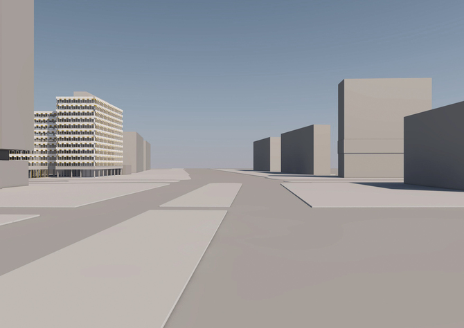 Es wird daher eine neue Fassade vorgeschlagen, die dem Gebäude mit zeitgemäßen baulichen Mitteln ein adäquates Gesicht verleihen soll. Dieses soll weder eine Imitation der alten Erscheinung sein, noch soll es jede Spur des Bestandes aus dem Gedächtnis des Ortes verbannen. So versteht sich die neue Gebäudehülle als eine Interpretation der Leitideen der Bestandsfassade, übersetzt und fortgeschrieben in einem neuen Material und einem neuen Konstruktionssystem. Die plastische Wirkung wird dabei nicht wie im Bestand durch formal aufgesetzte Ornamente erreicht, sondern entwickelt sich aus den funktionalen Elementen der Fassade und der Überlagerungssystematik ihrer konstruktiven Fügung. Die neue Hülle aus weißem und goldenem Aluminium wird aufgrund der Materialwahl feingliedriger und eleganter wirken als die grobe Bestandsfassade, auch wird man ihr unmissverständlich ihre Entstehungszeit ansehen. Und dennoch wird sie in den Grundzügen ihrer Erscheinung an ihre verschwundene Vorgängerin erinnern – ähnlich wie man im Gesicht des Enkelkindes manchmal den Großvater oder die Großmutter zu erkennen meint.