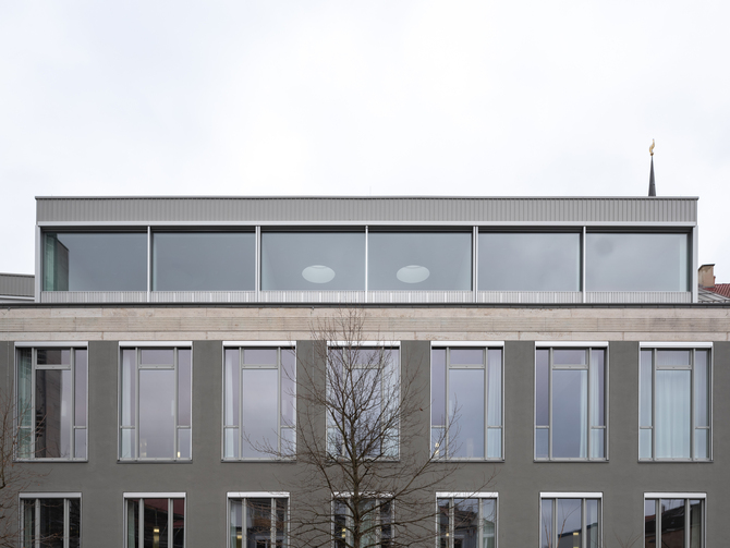 Die richtungsweisende Entscheidung das Justizgebäude zu erhalten und dessen Zukunft als Gerichtsstandort durch Sanierung und Aufstockung zu sichern, ist im Hinblick auf die Frage nach dem Umgang mit dem baulichen Erbe der Nachkriegszeit einerseits sehr zu begrüßen. Andererseits stellt die Errichtung einer Aufstockung einen erheblichen und planerisch komplexen Eingriff in den Bestand dar. Der Bestand wird denkmalgerecht saniert. Die Aufstockung versteht sich als eine selbstbewusste, zeitgenössische Ergänzung des bestehenden Ensembles, deren eigenständige konstruktive Struktur, Materialität und Rhythmus den Dialog mit der Architektur des Justizgebäudes sucht, ohne dessen formale Sprache direkt zu zitieren oder gar fortzuführen.