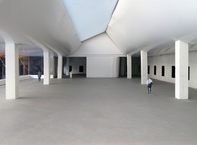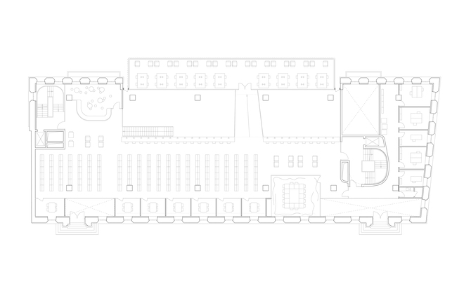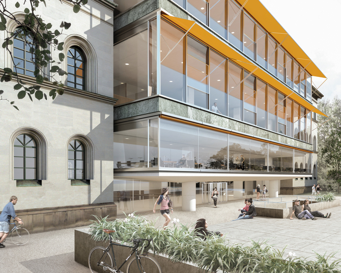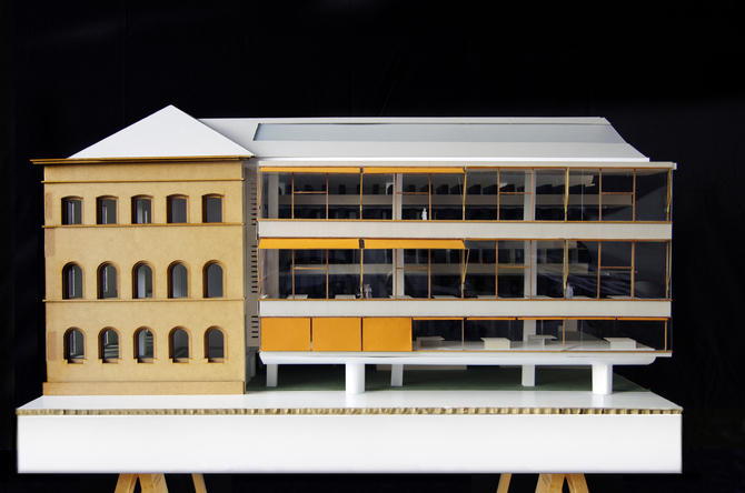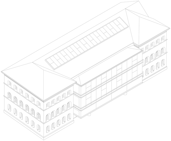 Ausgangspunkt des Projekts ist die entkernte Schale des Gärtnerbaus, die architektonische Ordnung, Maßstäblichkeit, Materialität und Räumlichkeit seiner Außenmauern. Der Neubau soll passgenau in das feine Gewand der Gärtnerfassade schlüpfen, um es mit Eigenständigkeit und Haltung tragen, ohne es zur Verkleidung oder Staffage zu degradieren. Die räumliche Struktur der Bibliothek ist elementar und im Grunde mit Ihrer Rohbaustruktur beschrieben: zwei Deckenplatten und ein Dach, getragen von zwölf kräftigen Stützen, ordnen den von der Bestandsfassade beschriebenen und belichteten Raum. Es entstehen - in Übereinstimmung mit der Gliederung der Bestandsfassaden - drei über einander gestapelte Hallen, die an Raumtypologien von Magazinen oder Manufakturen des 19. Jahrhunderts erinnern mögen, wie das Semperdepot in Wien oder das Entrepot Royal in Brüssel. In den Hauptgeschossen wird die generische konstruktive Grundordnung ergänzt durch die nutzungsspezifischen Einbauten und Möbel, deren Anordnung im Raum sich insbesondere den natürlichen Lichtverhältnissen innerhalb der drei Etagen anpasst. Die Erscheinung der neuen Fassade lässt sowohl Bezüge zur Materialität und Farbigkeit der Bauten der Ludwigstraße als auch zu den umgebenden Institutsbauten der Nachkriegszeit zu.