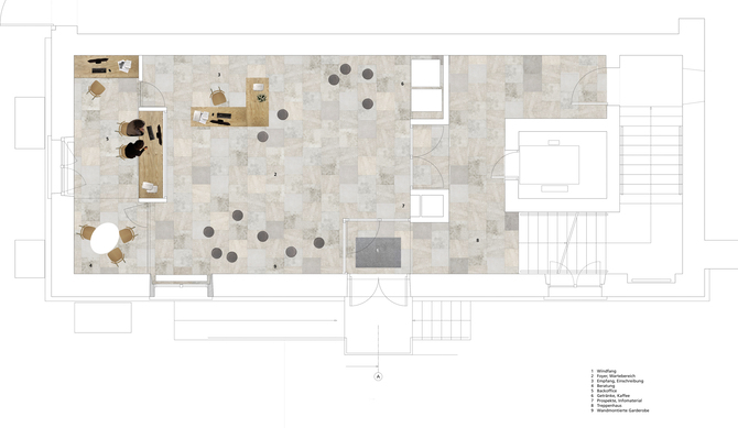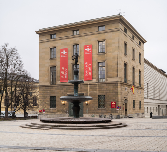 Das Instituto Cervantes ist prominent untergebracht, unmittelbar angrenzend an die Münchner Residenz, im Kopfbau des Depotgebäudes der Oper. Das Foyer muss aus brandschutztechnischen Gründen umgebaut werden. Es werden Einbauten aus Trockenbau und Holz vorgeschlagen, die auch die wesentlichen Funktionen wie Getränkeautomaten, Empfang, Wartebereich usw. aufnehmen.