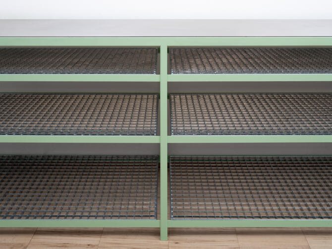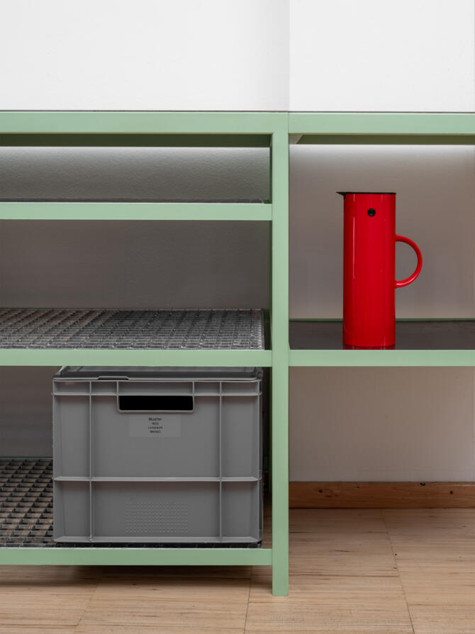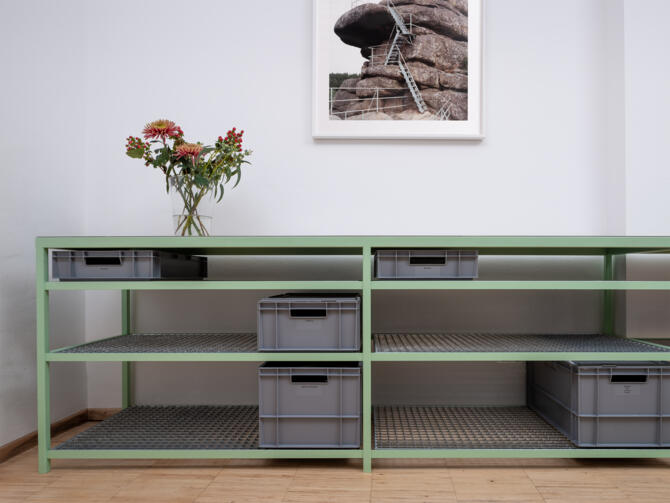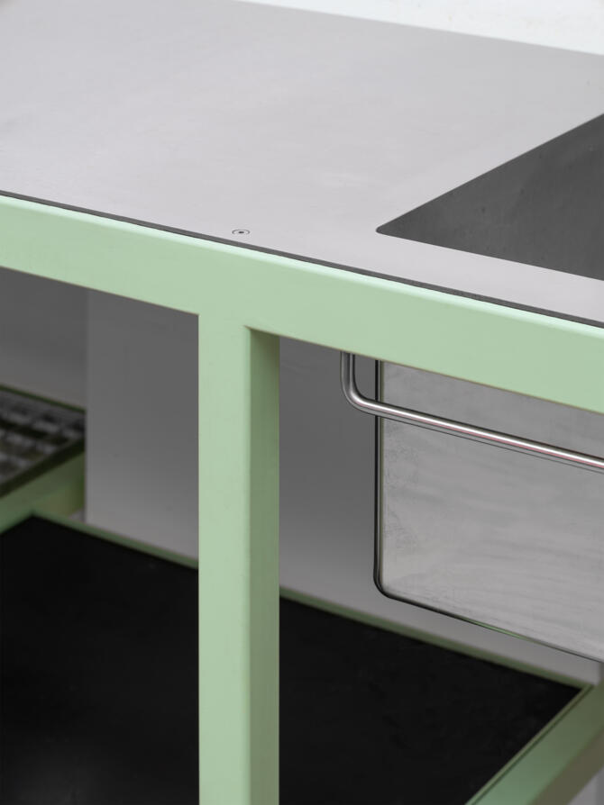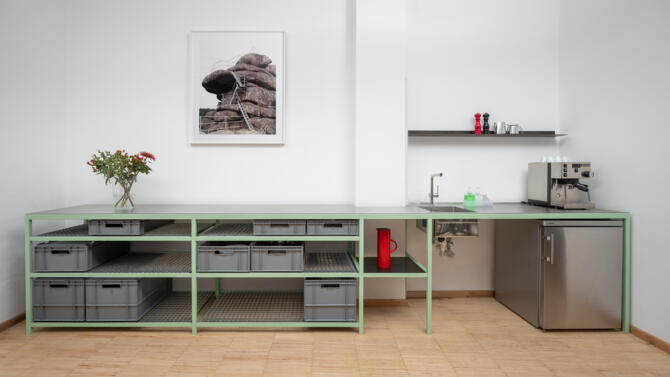 Metallgestell aus beschichteten Stahlprofilen, Arbeitsplatte aus Edelstahl und Industriegittern, die als Regalböden dienen. Eine neutrale Optik war gewünscht um sowohl der Küchennutzung, als auch der gleichzeitigen Nutzung als Besprechungsraum gerecht zu werden. Die Dimensionen des Gestells sind auf die Normgrößen der Industriegitter und auf die verschieden große Euroboxen abgestimmt. Letztere beinhalten Küchen- sowie Büroinventar.