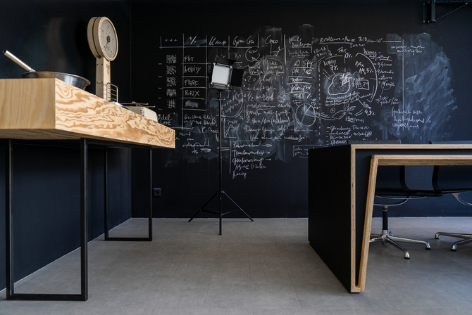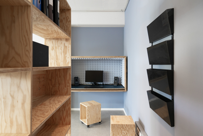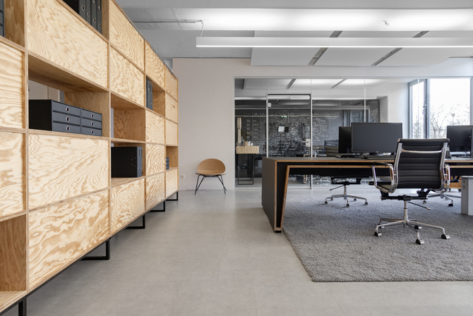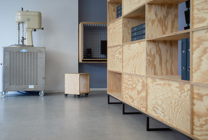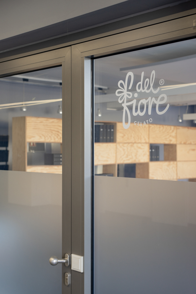 Nachdem wir die Produktionsstätten der Del Fiore Speiseeismanufaktur in München realisieren durften, wurden wir mit der Gestaltung der Erweiterungsflächen und Büroräume beauftragt. Die Elemente des raumbildenen Ausbaus tragen dem handwerklichen Charakter der Eisproduktion von Stefano De Giglio und Flavio Chouquer wie auch der Industriearchitektur des Bestandsgebäudes Rechnung. Der Büroraum dient auch dem Empfang und dem Gespräch mit Kunden. Alle Möbel mit Ausnahme der Bestuhlung wurden eigens für den Raum maßangefertigt und bestehen aus Seekieferplatten, MDF und Stahl.
