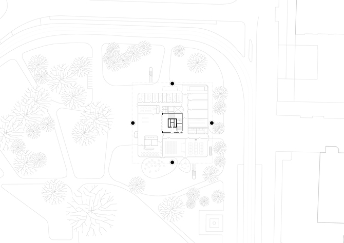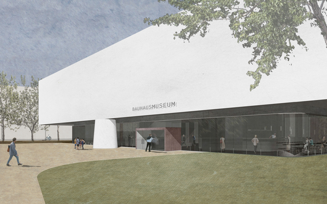 Ein quadratischer, strahlend weißer Körper, abgestellt auf vier kräftigen Pfeilern im Dessauer Stadtpark: das neue Bauhausmuseum. Der über 2.100m2 große Ausstellungsbereich, in dem die Schätze des „Kosmos Bauhaus“ gezeigt und erklärt werden, schwebt über dem Park und ist von der Umgebung vollkommen abgeschottet: Hier stehen die Geschichte und Werke des Bauhaus im Mittelpunkt des Geschehens. Die Räume des Erdgeschosses öffnen sich hingegen großzügig zur umgebenden Stadtlandschaft und lassen den öffentlichen Raum weit in das Haus eindringen.