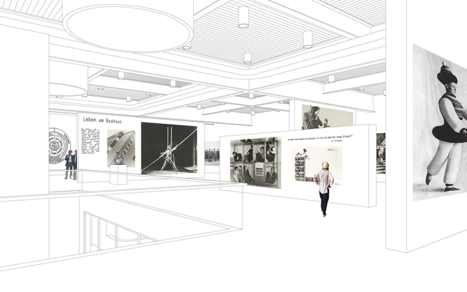 Der Ausstellungsbereich hat keine Abfolge vordefinierter Räume. Vielmehr bietet er ähnlich einer großen Werkhalle die Möglichkeit, sowohl mit bewährten als auch vollkommen neuen Formen der Ausstellungsgestaltung zu experimentieren. Die große Halle erlaubt die Schaffung eines frei fließenden räumlichen Kontinuums: Die einzelnen in der Sammlung gezeigten Topoi erscheinen nicht als voneinander abgeschottete Themenfelder, ihre Inhalte verflechten und überlagern sich miteinander. Die technische Erschließung der Ausstellungshalle erfolgt über den zentralen Versorgungskern. Dessen rohe, industrielle Anmutung mag daran erinnern, dass das Bauhaus ein Ort der experimentellen Produktion, des Machens, des Konstruierens war.