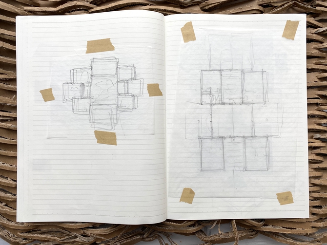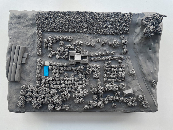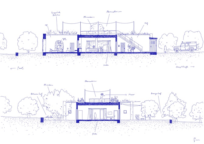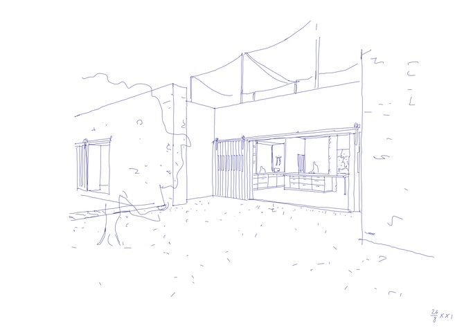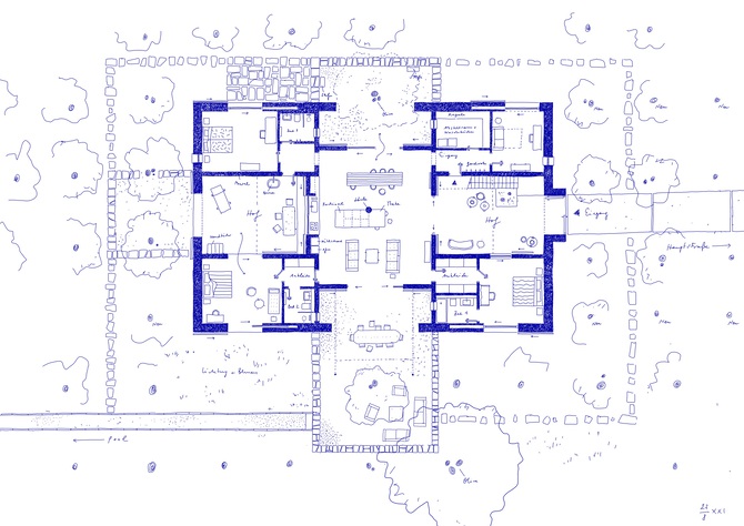 Kanali, a small coastal village in northwestern Greece. The orange plantation, about one hectare in size, lies one kilometer behind the coast and is surrounded by low hills, agricultural fields and isolated houses. The new house is to stand in the middle of the plantation. A self confident, symmetrical figure, a non-directional pavilion with four rooms grouped around a central living hall.