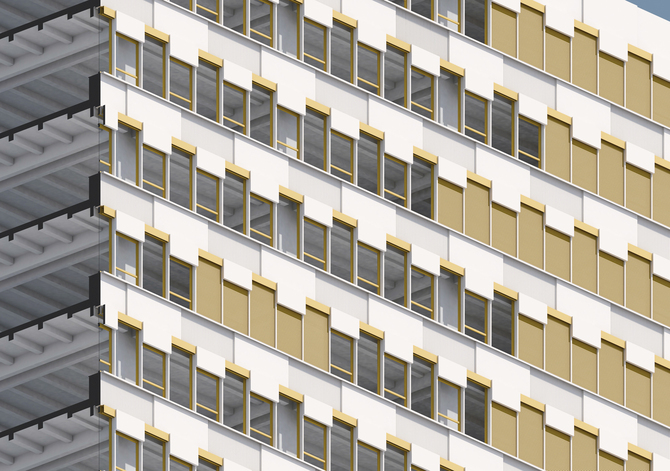 Es wird daher eine neue Fassade vorgeschlagen, die dem Gebäude mit zeitgemäßen baulichen Mitteln ein adäquates Gesicht verleihen soll. Dieses soll weder eine Imitation der alten Erscheinung sein, noch soll es jede Spur des Bestandes aus dem Gedächtnis des Ortes verbannen. So versteht sich die neue Gebäudehülle als eine Interpretation der Leitideen der Bestandsfassade, übersetzt und fortgeschrieben in einem neuen Material und einem neuen Konstruktionssystem. Die plastische Wirkung wird dabei nicht wie im Bestand durch formal aufgesetzte Ornamente erreicht, sondern entwickelt sich aus den funktionalen Elementen der Fassade und der Überlagerungssystematik ihrer konstruktiven Fügung. Die neue Hülle aus weißem und goldenem Aluminium wird aufgrund der Materialwahl feingliedriger und eleganter wirken als die grobe Bestandsfassade, auch wird man ihr unmissverständlich ihre Entstehungszeit ansehen. Und dennoch wird sie in den Grundzügen ihrer Erscheinung an ihre verschwundene Vorgängerin erinnern – ähnlich wie man im Gesicht des Enkelkindes manchmal den Großvater oder die Großmutter zu erkennen meint.