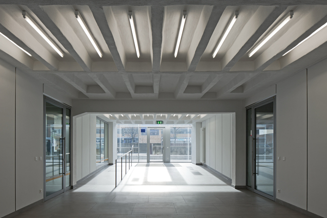Konzeption, Lage und Ausformung der neuen Erschließungselemente beheben Brandschutz- und Erchließungsmängel der bestehenden Struktur und ermöglichen eine flexiblere und kleinteilige Vermietung der Loftgeschosse. Dabei gilt es, architektonisch einen angemessenen Umgang mit einer heterogenen, in mehreren Bauabschnitten gewachsenen Industriestruktur zu finden. So werden die Eigenheiten der zu unterschiedlichen Zeiten und mit unterschiedlichen Konstruktionssystemen entstandenen Bauteile durch das neue Fassadenkonzept hervorgehoben und sichtbar gemacht.