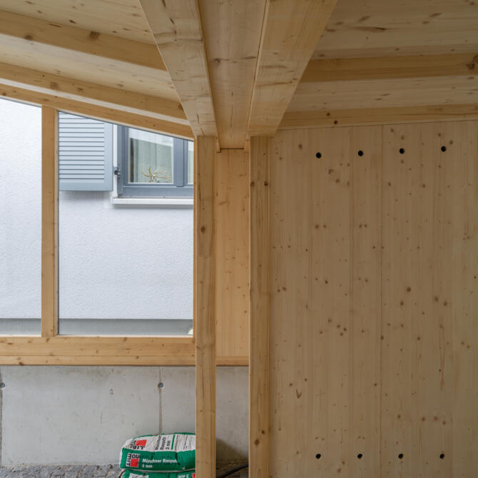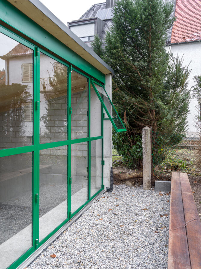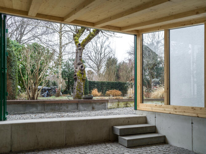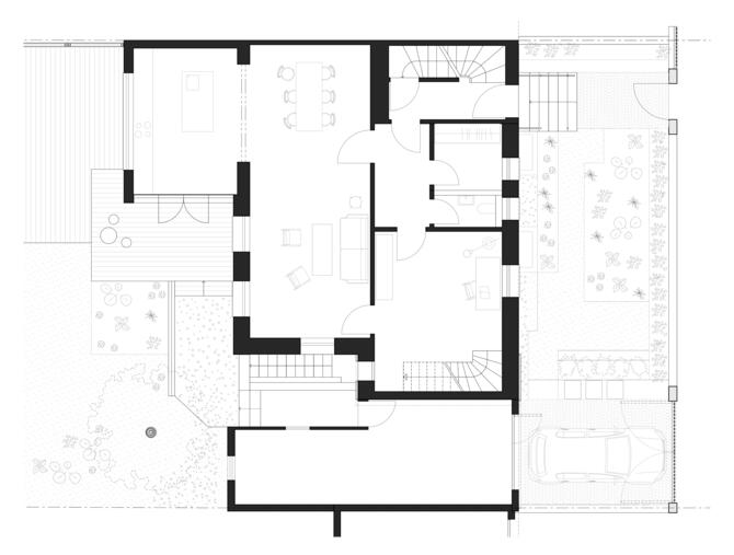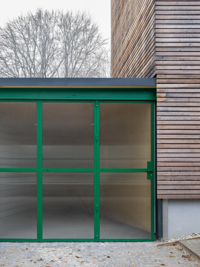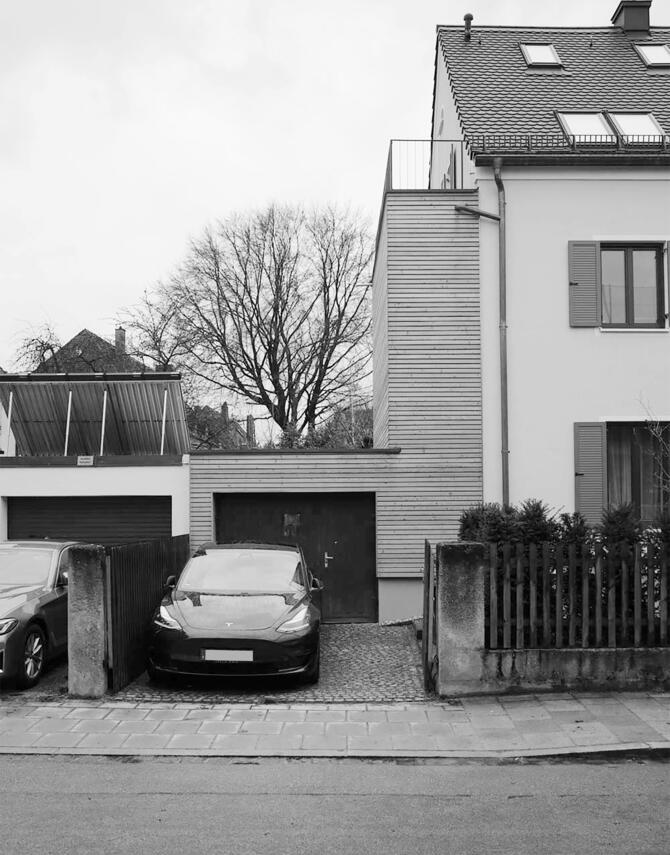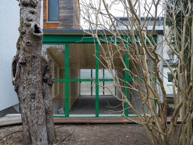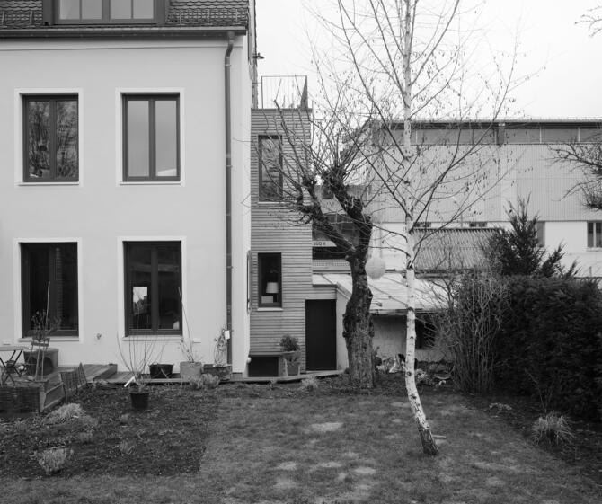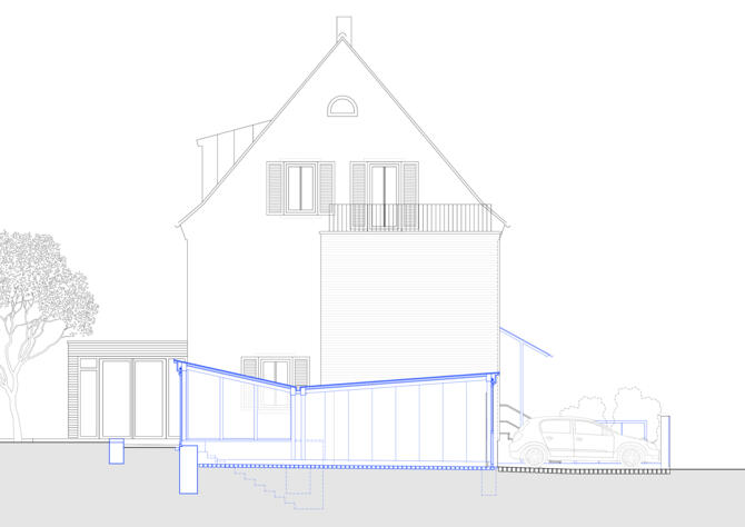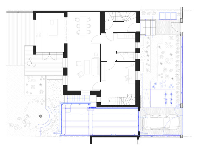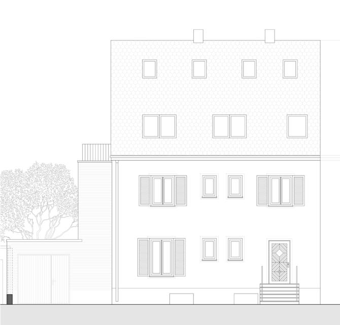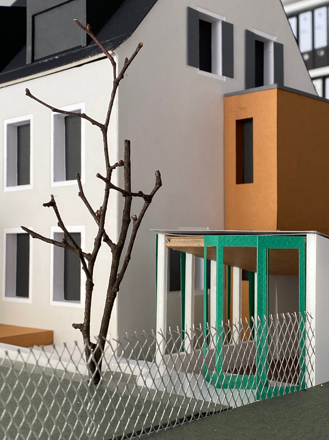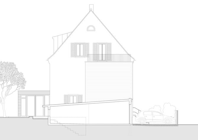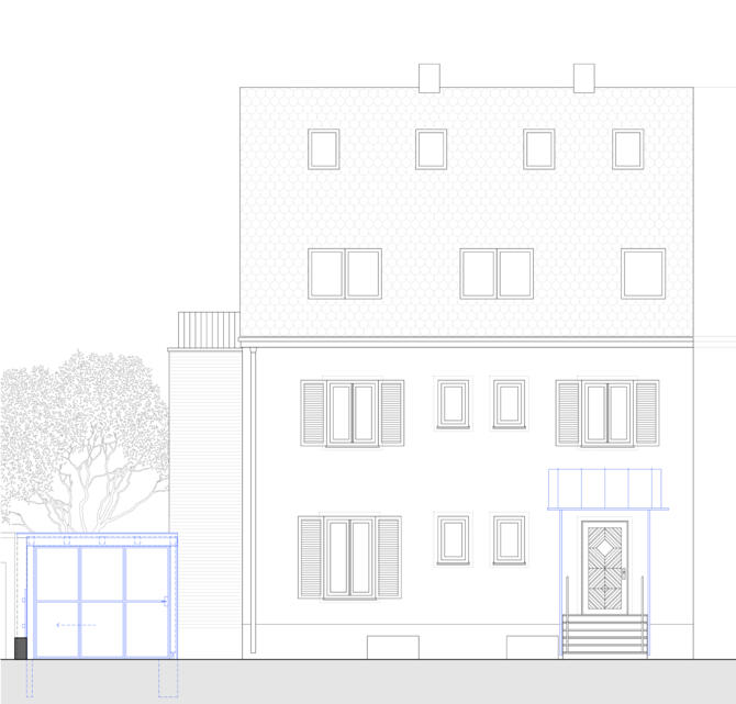 Erst kürzlich wurde die Doppelhaushälfte von ihren neuen Besitzern umgebaut. Ein gutes Jahr später sollen kleine Eingriffe und Ergänzungen erfolgen: Die bestehende Garage soll abgerissen und durch einen funktional offenen Raum ersetzt werden, der nicht nur das Elektroauto der Familie beherbergen wird, sondern auch - gerade im Sommer - viele weitere Nutzungen erlauben wird: Atelier, Gewächshaus, Partyraum, Spielzimmer, Werkstatt usw. Der Eingang erhält eine leichte Überdachung, ebenso die Fahrräder und Mülltonnen.