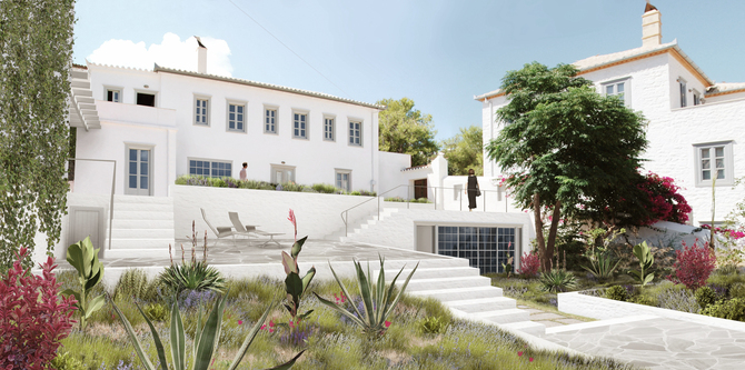 Das bestehende Haus liegt hoch über dem Hafen von Hydra in ausgeprägter Hanglage. Sein Gartenhof ist wie ein Platz, umgeben von Nachbarhäusern und durchzogen durch das topografische Gefälle. Gegen Nordwesten ist der Blick über die malerische Hafenstadt mit der Seefahrertradition hinüber zum Peloponnes ungestört. Die Renovierungsarbeiten am rund 100 Jahre alten Elternhaus brach der Vorbesitzer ab und verkaufte. Neben der Planung des Ausbaus gilt es insbesondere den brach liegenden Gartenhof zu gestalten und das Haus um einen Atelierraum zu erweitern. Der Hof wird als Teil der unzähligen öffentlichen Treppen und Platzräume der Insel uminterpretiert. In der topografischen Neuordnung des Grundstücks findet auch ein Gartenatelier als Erweiterung des Hauses unauffällig seinen Platz.