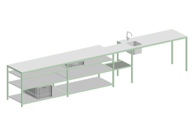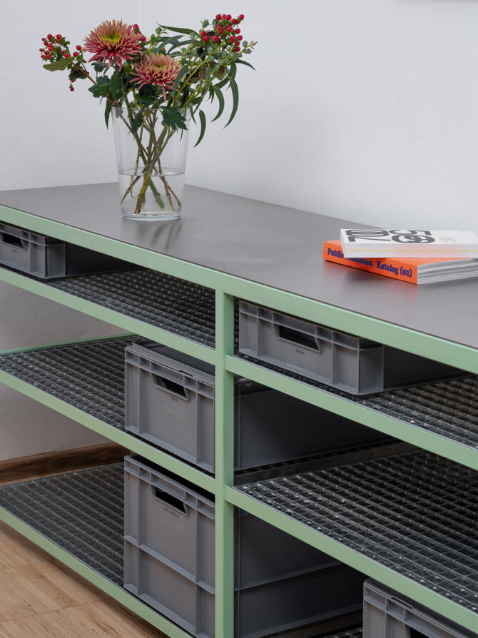 Metallgestell aus beschichteten Stahlprofilen, Arbeitsplatte aus Edelstahl und Industriegittern, die als Regalböden dienen. Eine neutrale Optik war gewünscht um sowohl der Küchennutzung, als auch der gleichzeitigen Nutzung als Besprechungsraum gerecht zu werden. Die Dimensionen des Gestells sind auf die Normgrößen der Industriegitter und auf die verschieden große Euroboxen abgestimmt. Letztere beinhalten Küchen- sowie Büroinventar.