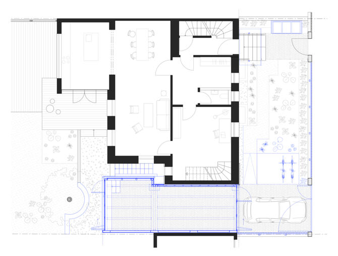 Erst kürzlich wurde die Doppelhaushälfte von ihren neuen Besitzern umgebaut. Ein gutes Jahr später sollen kleine Eingriffe und Ergänzungen erfolgen: Die bestehende Garage soll abgerissen und durch einen funktional offenen Raum ersetzt werden, der nicht nur das Elektroauto der Familie beherbergen wird, sondern auch - gerade im Sommer - viele weitere Nutzungen erlauben wird: Atelier, Gewächshaus, Partyraum, Spielzimmer, Werkstatt usw. Der Eingang erhält eine leichte Überdachung, ebenso die Fahrräder und Mülltonnen.